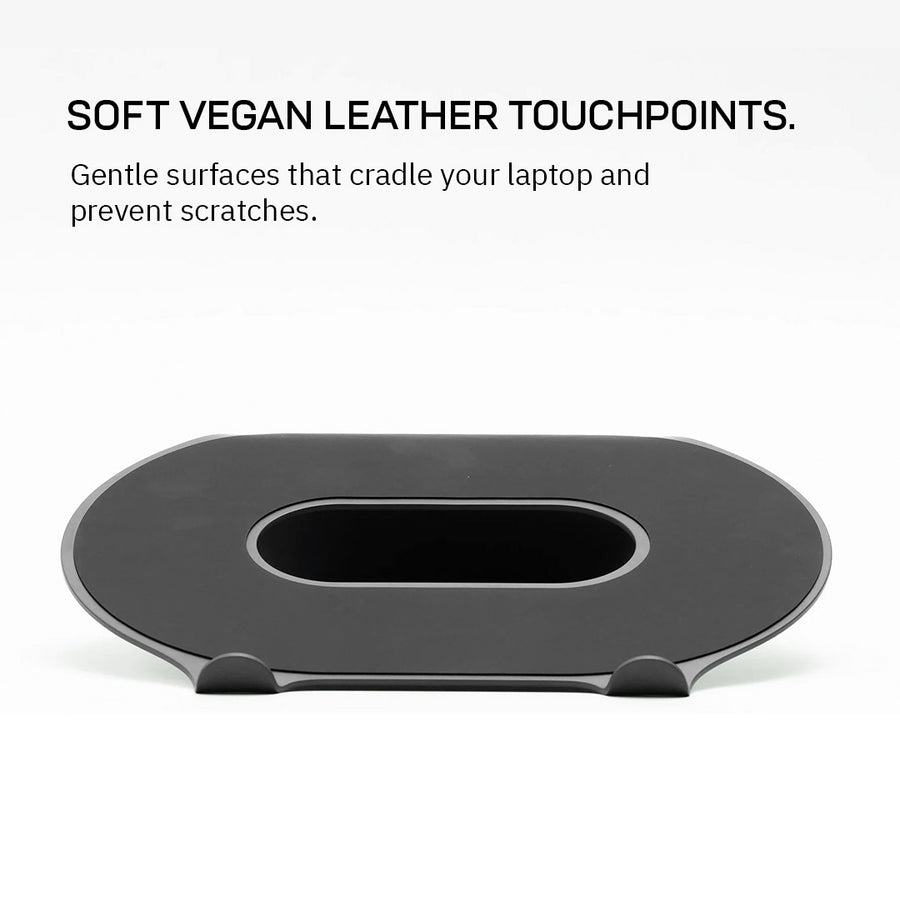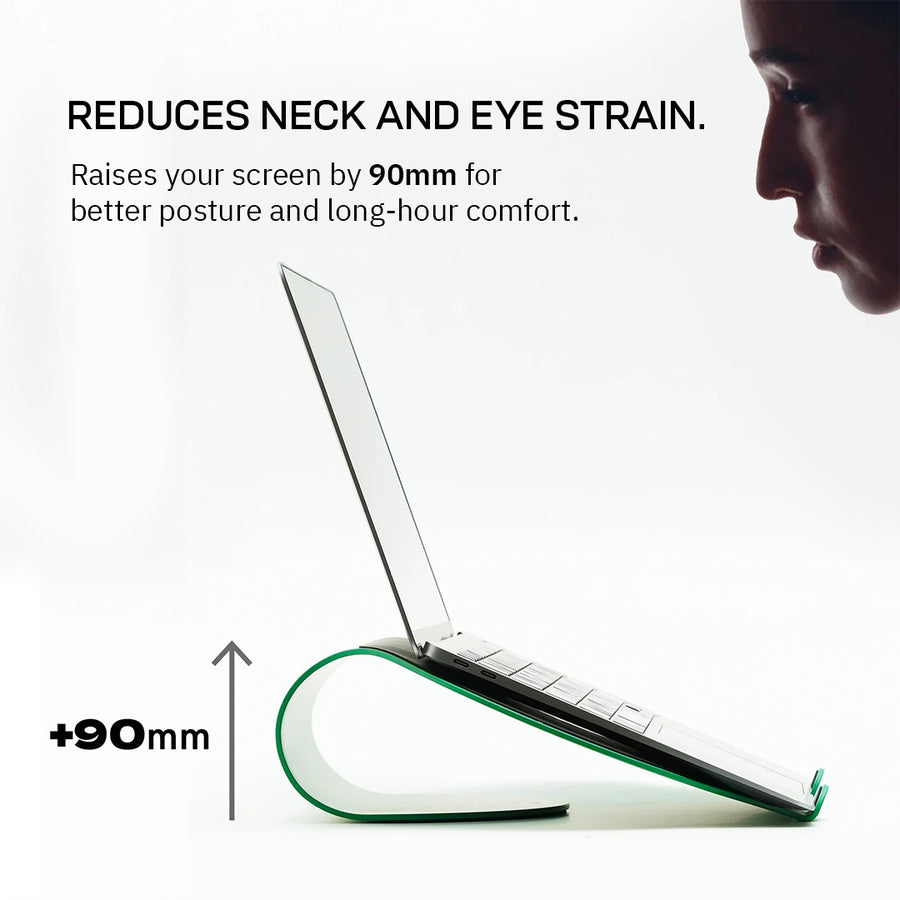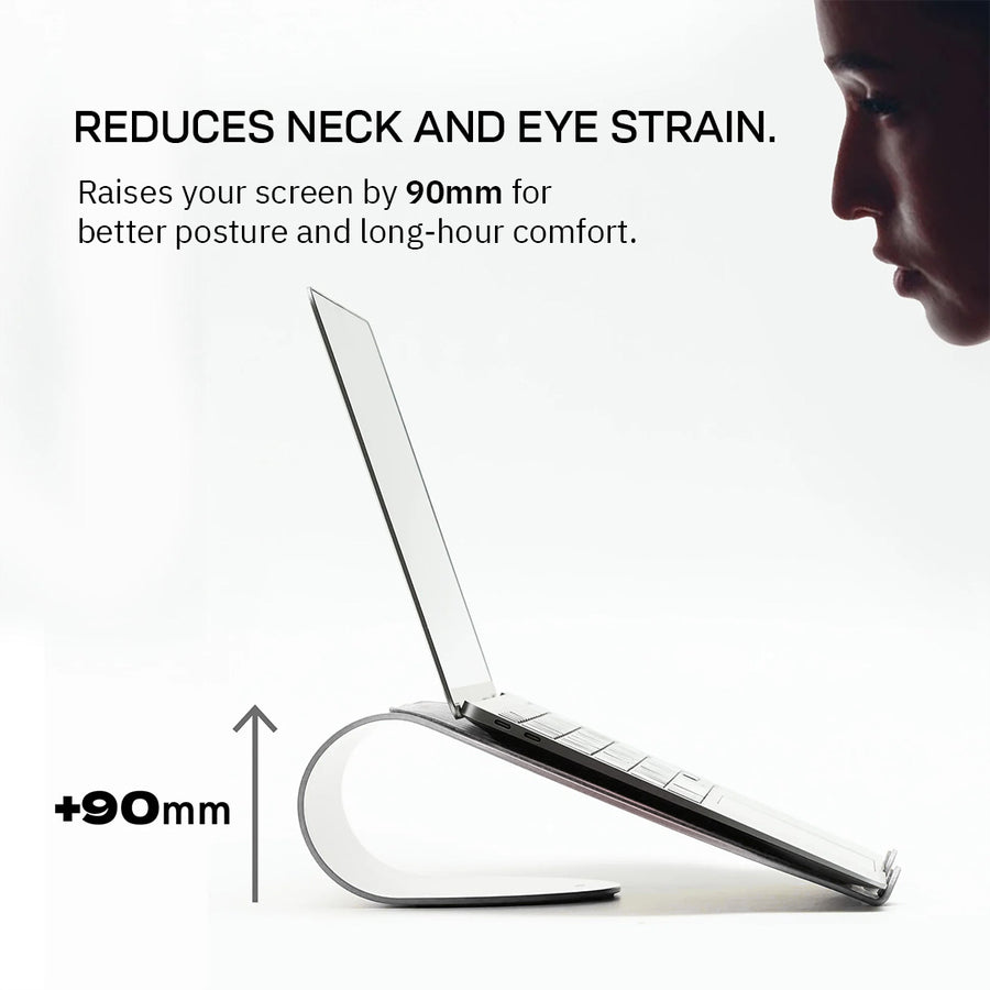 A sleek laptop stand that lifts your screen by 90 mm for better posture and reduced neck and eye strain. Crafted with a soft padded front for secure support, a slip-resistant base for stability, and a central void for efficient heat dissipation.